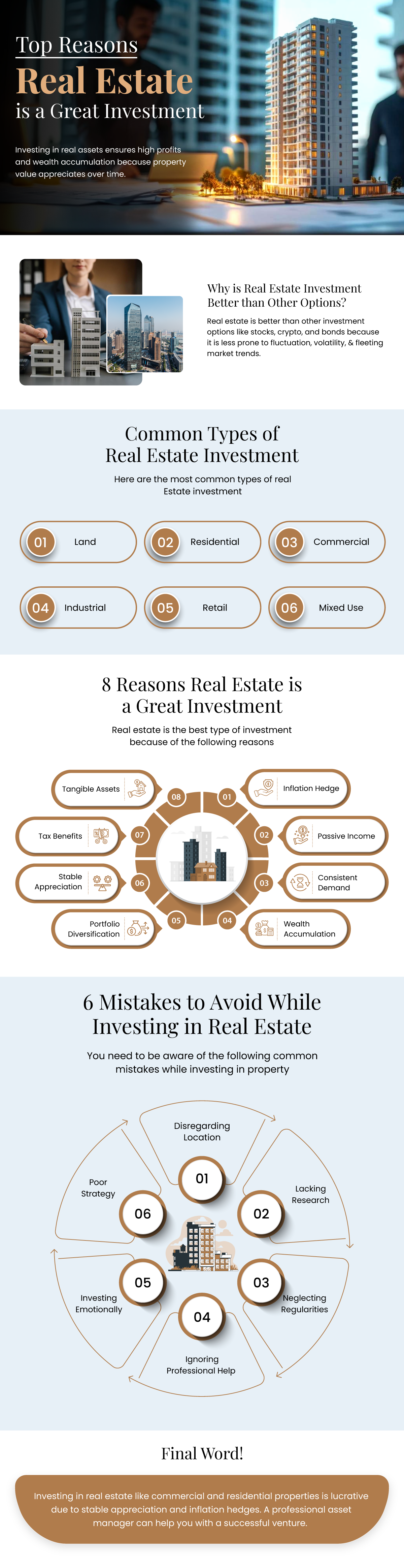 Investing in real estate like commercial and residential properties is lucrative due to stable appreciation and inflation hedges. A professional asset manager can help you with a successful venture.